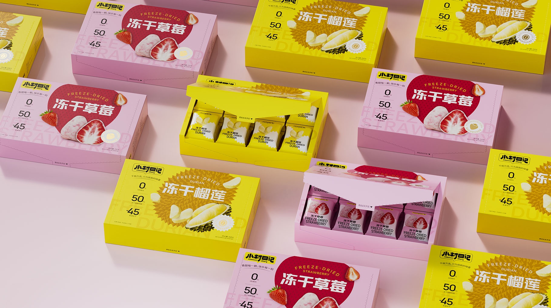 小村日記,凍干草莓包裝設(shè)計(jì)、凍干榴蓮包裝設(shè)計(jì)、綜合果蔬脆包裝設(shè)計(jì),食品包裝設(shè)計(jì)