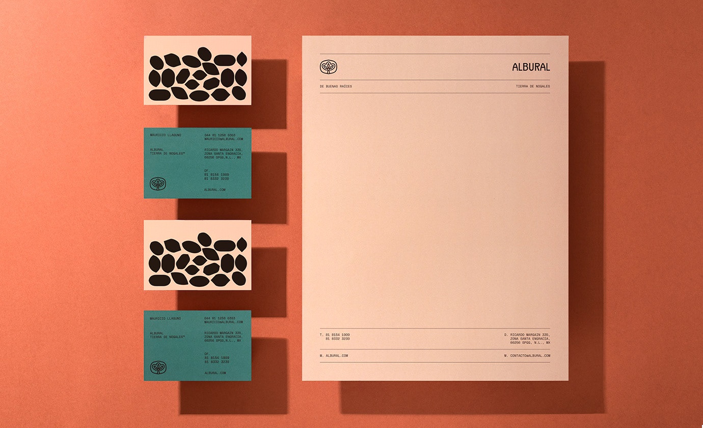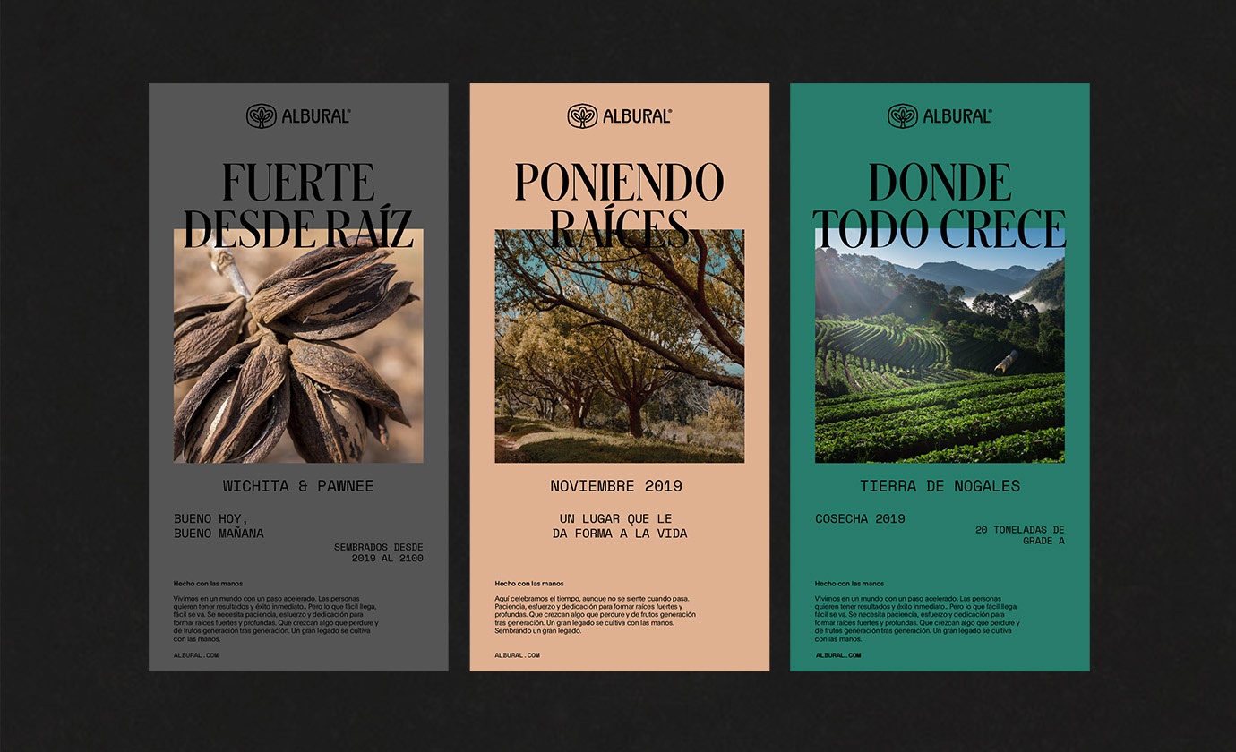 Albural是墨西哥建造的最大的山核桃果園之一。 Albural知道人生中最美好的事情需要時間。 果園是由一個擁有強大價值觀和更強職業(yè)道德的家庭從頭開始建造的。 作為其家族傳承的一部分,Albural旨在延續(xù)數(shù)代之久,因此我們必須創(chuàng)建一個可以承受的品牌。 家庭是標(biāo)識中的核心概念,這就是為什么品牌標(biāo)記既是果園中的家譜又是山核桃樹的象征。 我們根據(jù)山核桃殼的不同形狀創(chuàng)建了不同的圖案,這些形狀以“堆棧”的形式組裝在一起,使該品牌既輕巧又有趣。 結(jié)果是一個強大而永恒的品牌,擁有獨特的視覺系統(tǒng),傳達(dá)了一個強大家庭的故事,并將成為偉大遺產(chǎn)的開端。